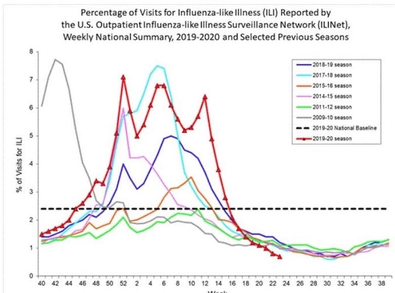 Note: Flu seasons begin in late September and continue into early May. In the 2019-2020 flu season, cases of ILI were elevated beginning in October 2019 and remained conspicuously-elevated through March 2020. (Covid lockdowns to “stop spread” began on or around March 15, 2020 - at least five months after excess numbers of Americans had begun to fall ill with ILI or Covid-like symptoms).